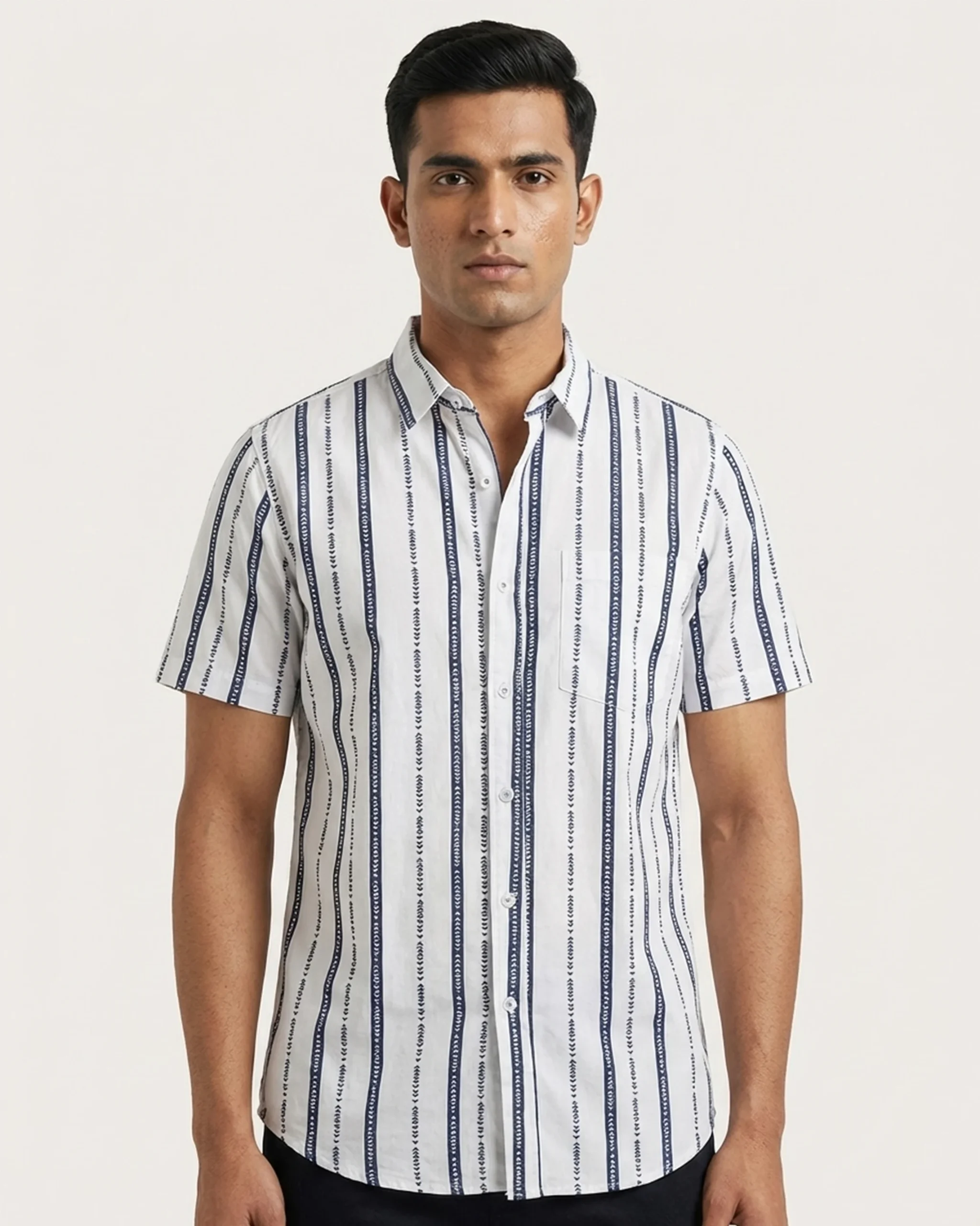 Fresh, airy, and detailed—the Arctic Tribal Stripe is a summer essential. The bright white base provides a clean look, while the navy blue etched patterns add a layer of sophistication and craftsmanship. This shirt is designed to bridge the gap between beach casual and urban refined.
