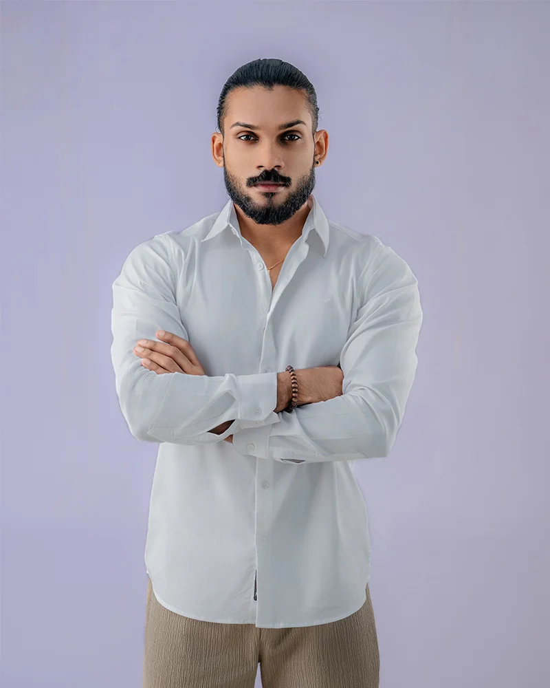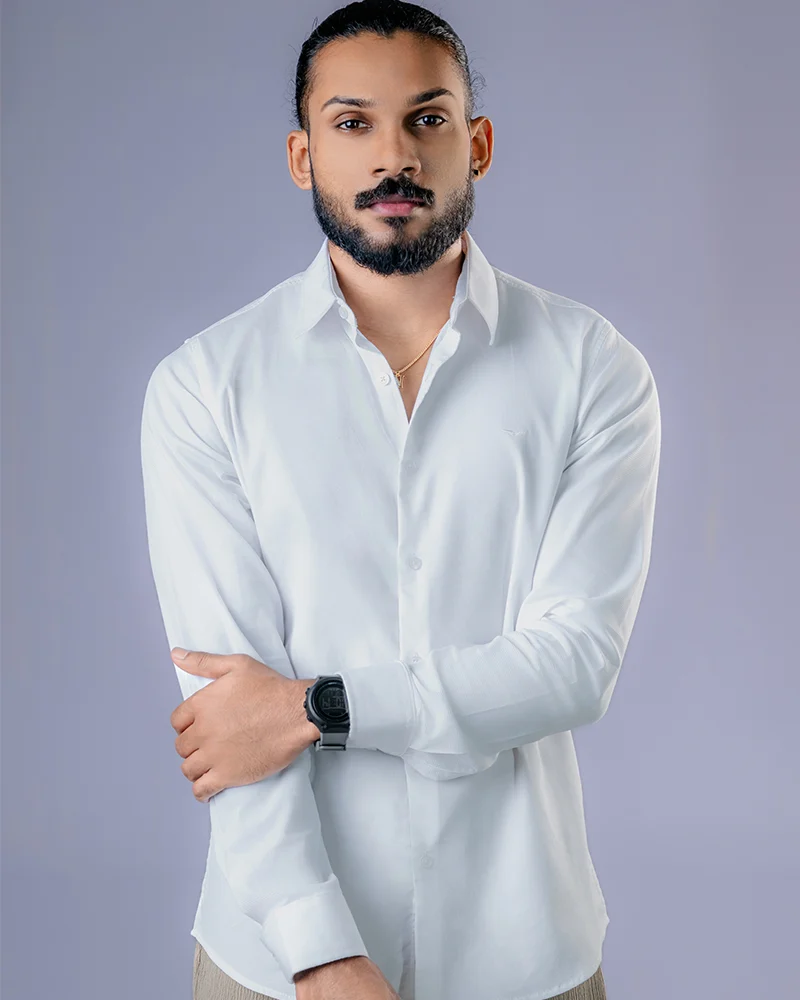 The Classic White Plain Shirt is a versatile long-sleeve essential designed for clean, everyday style. Made from 100% premium cotton with a solid 180 GSM fabric weight, this shirt features a sharp slim fit and a crisp, solid white finish that feels confident without being stiff. It is an ideal choice for smart-casual wear in Sri Lanka, offering a non-transparent build, lasting structure, and breathable comfort for daily use and social settings.