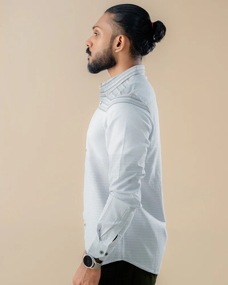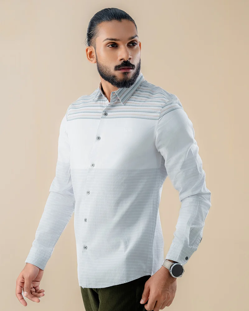 ✔ Horizontal Stripe Orientation: The horizontal lines are precision-aligned to create a visually balanced effect, enhancing the shirt’s streamlined and smart-casual appearance.