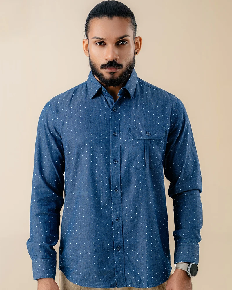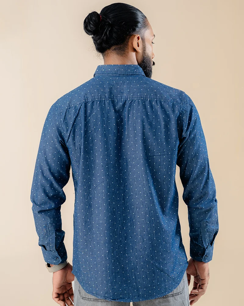 The Indigo Denim Dot Shirt is a rugged yet refined long-sleeve denim shirt featuring a classic micro-dot pattern, designed for casual and smart-casual wear with a slim-fit silhouette. Made from 100% pure indigo-dyed cotton with a substantial 180 GSM weight, it offers natural breathability and a comfortable, close-to-body fit. The durable fabric and subtle dot design make it perfect for relaxed outings, casual gatherings, or stylish everyday wear.