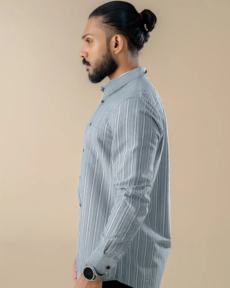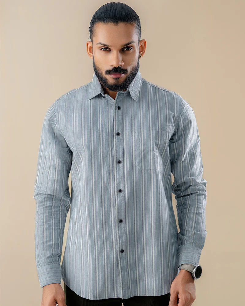 The NavyMist Stripe Shirt by iKING is a versatile addition to a man’s casual wardrobe. Designed with a focus on comfort and a clean, modern look, it’s perfect for relaxed outings and smart-casual social gatherings. The vertical stripe pattern adds a sharp, streamlined appearance that pairs effortlessly with a variety of casual bottoms.