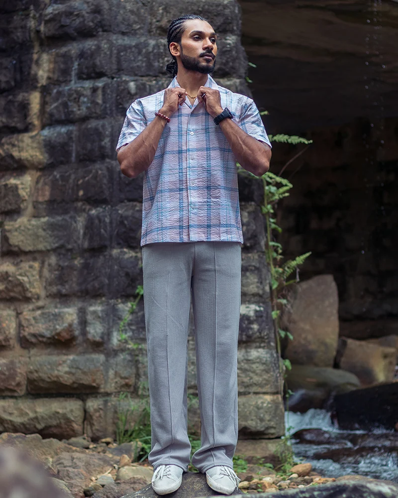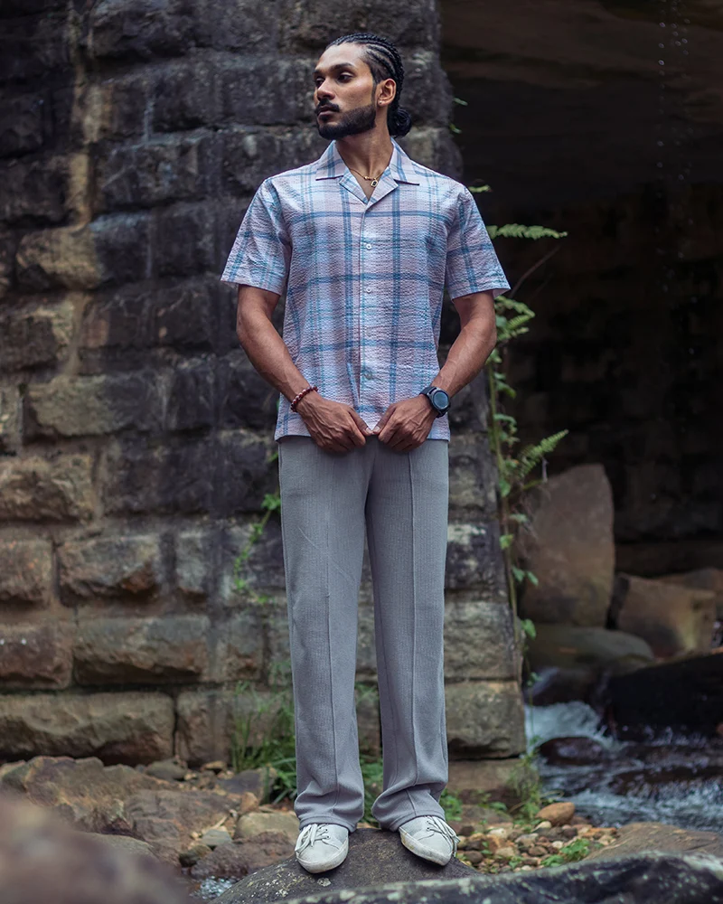 Redefine your leisure wardrobe with the RoseCheck Elite Shirt, a masterpiece of textile innovation featuring a high-stretch popcorn weave. The shirt showcases a sophisticated rose-quartz and slate-blue windowpane check, offering a three-dimensional texture that is as visually striking as it is comfortable.
