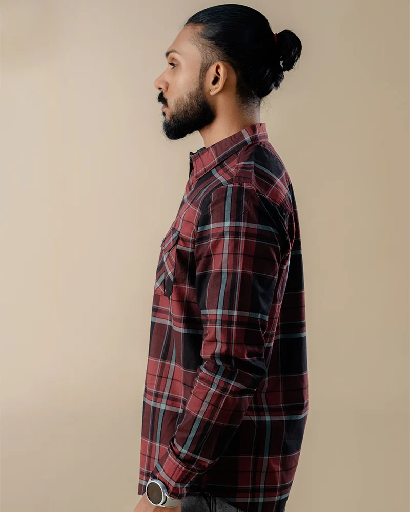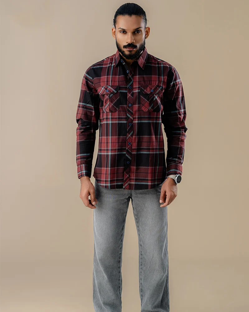 The VelvetShadow Grid Shirt is a premium long-sleeve shirt with a deep-toned, high-definition micro-grid pattern, designed for casual and smart-casual wear with a slim-fit silhouette. Made from 100% pure cotton with a substantial 180 GSM weight, it offers natural breathability and a comfortable, close-to-body fit. The charcoal and midnight tones create a sleek, modern look perfect for relaxed outings, casual gatherings, or everyday stylish wear.